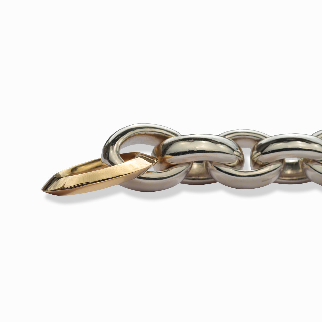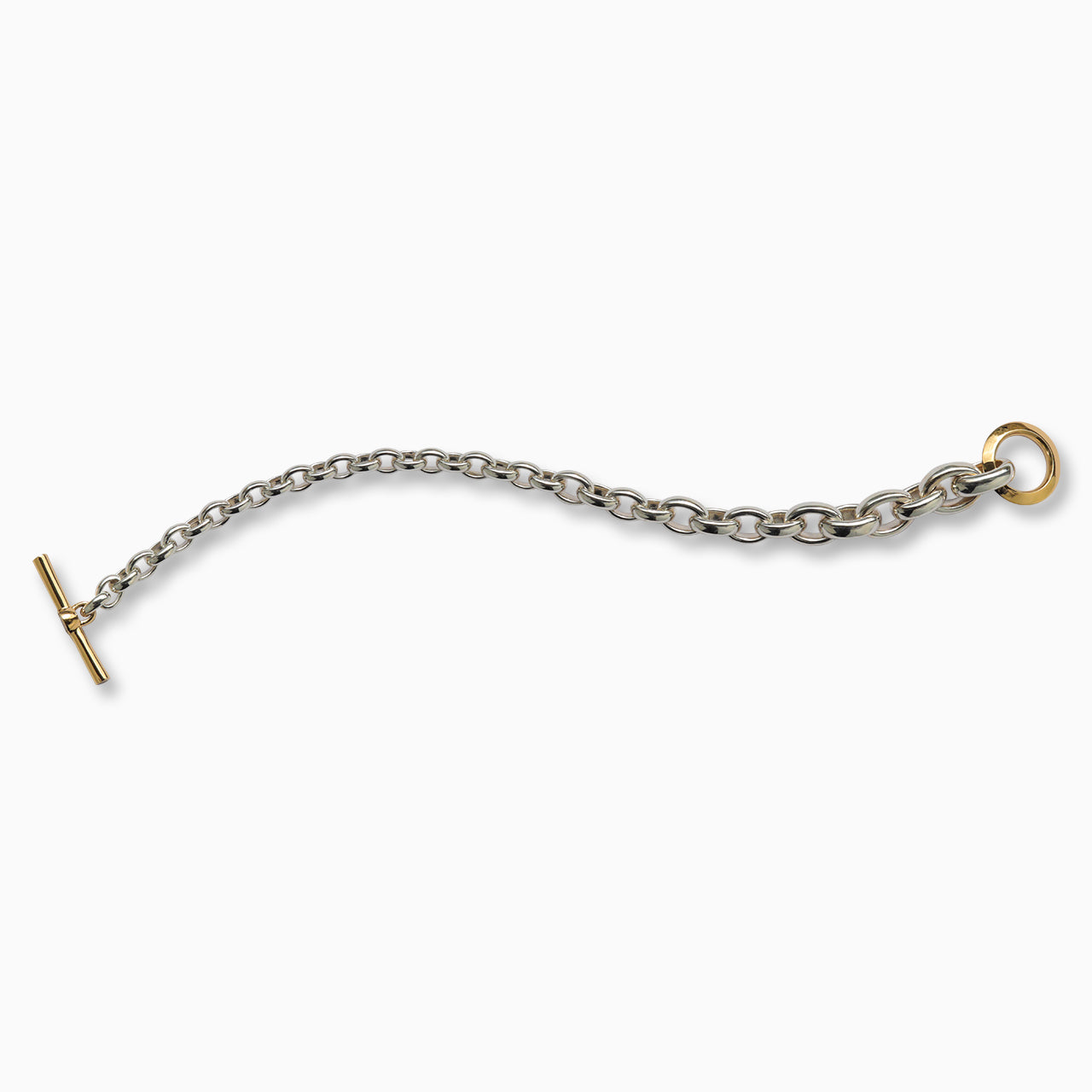 Tバーとサークルが交差する一点にダイヤモンドを配し、ブレスレット全体の重心と視線を、そこへ静かに集約させています。
