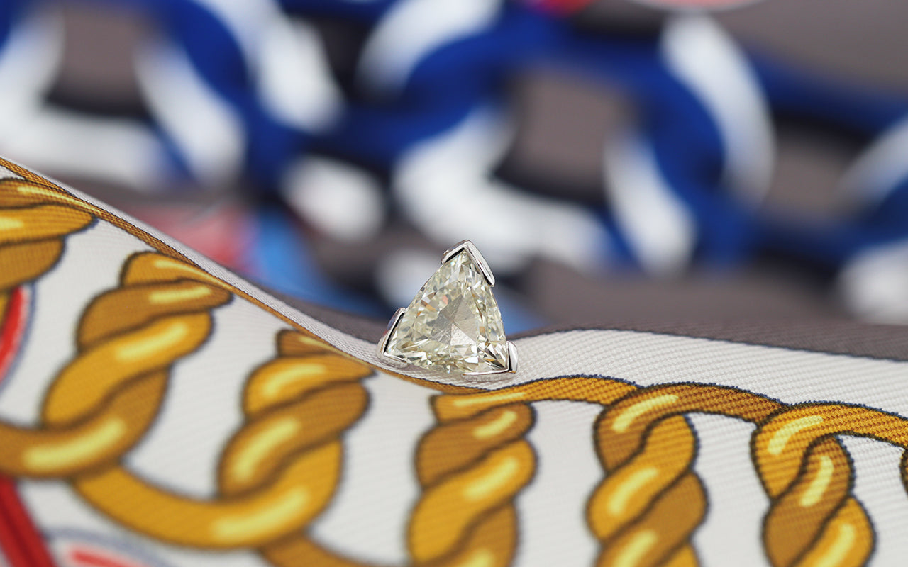 トリリアントカットの鋭角を、地金が静かに受け止める。守るための構造でありながら、その造形を隠さず、むしろ際立たせる。建築的な強さと、光を解き放つ繊細さが共存するミニマムデザイン。